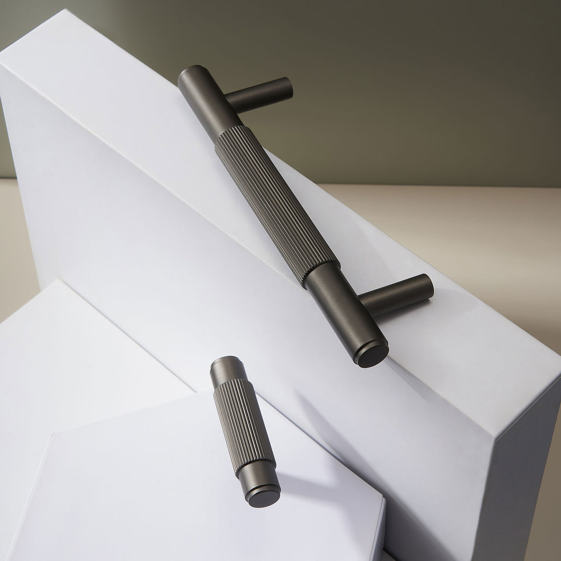 Black cabinet handle made of solid brass with ribbed surface. A modern cabinet handle and one of our absolute best sellers in the store. Suitable for kitchen cabinet doors as well as for bathroom vanities or furniture. Its solid weight combined with the ribbed details does not go unnoticed. A premium cabinet handle for those who value detail and quality.