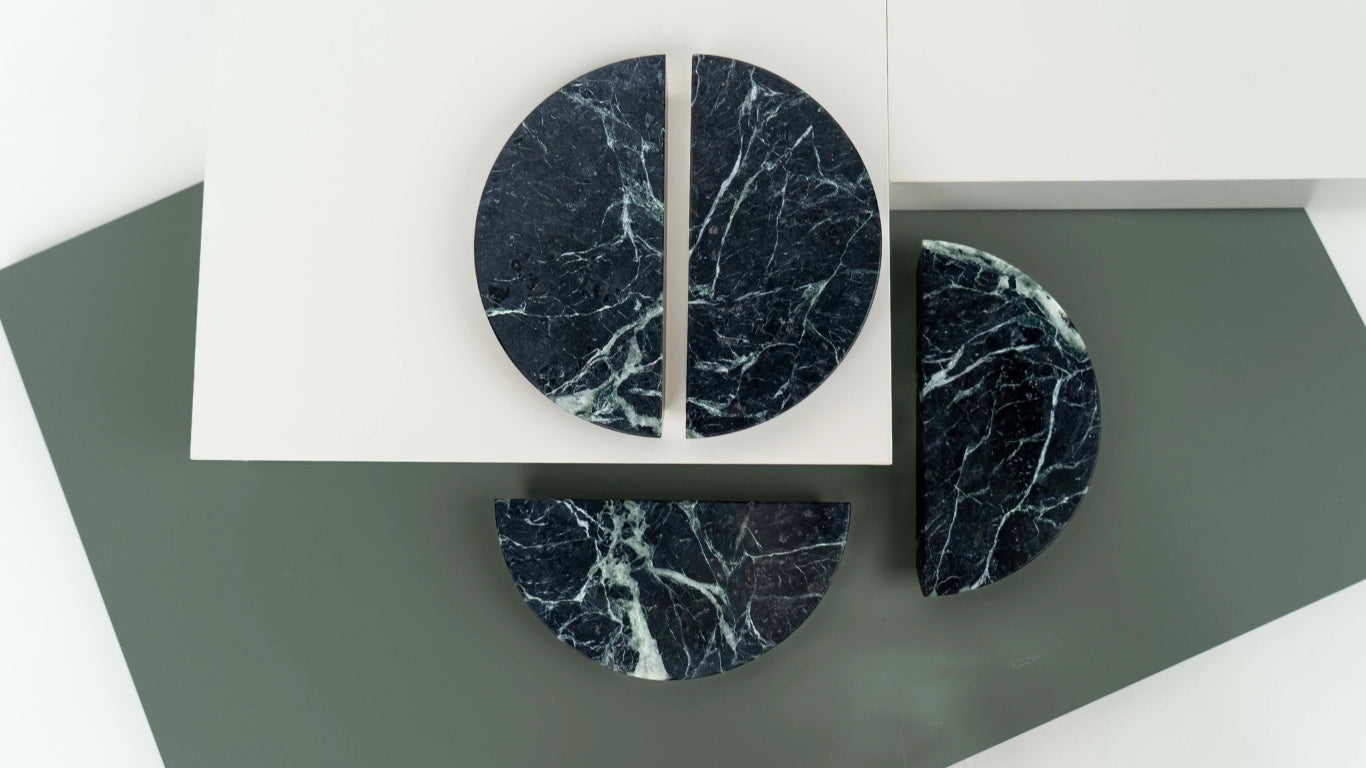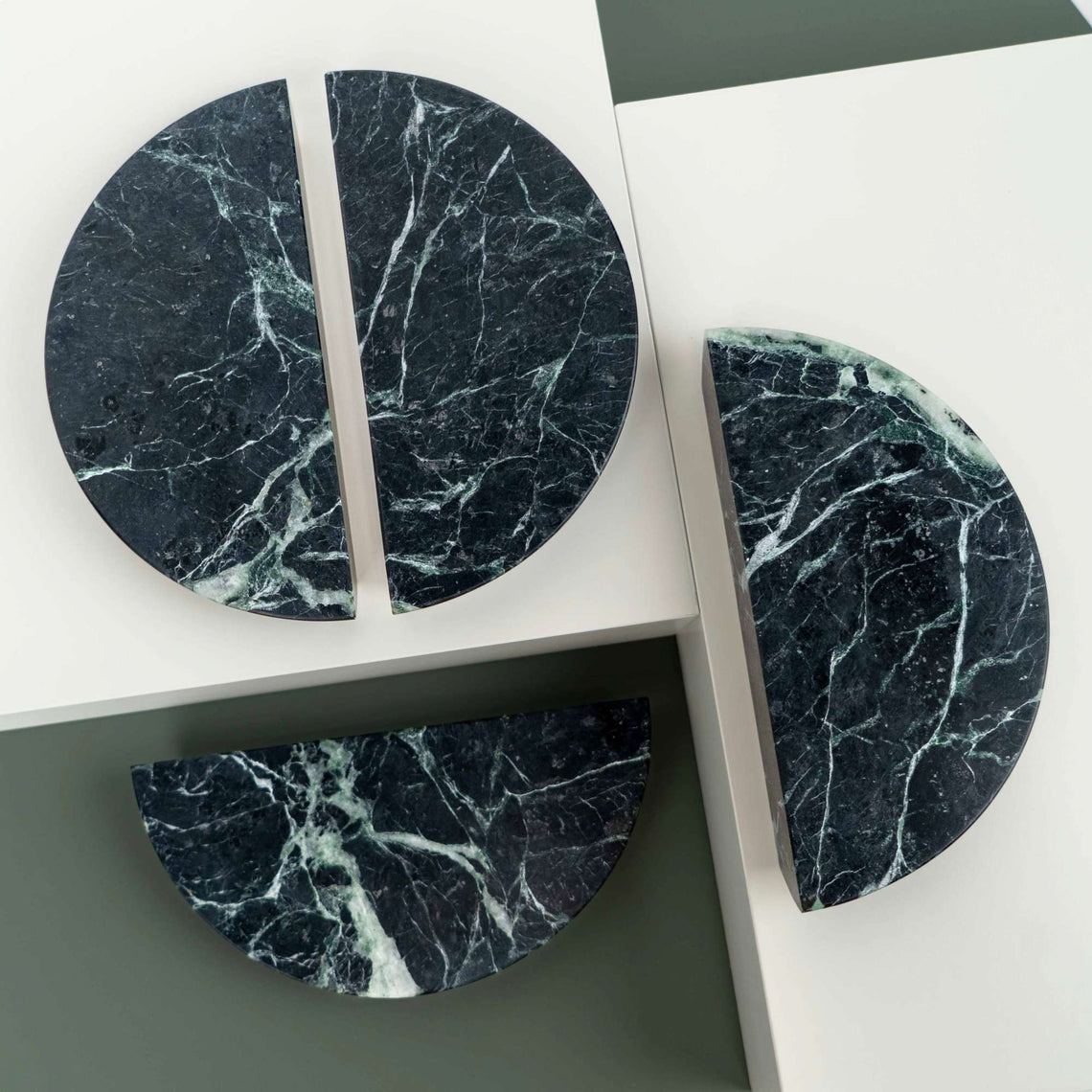 Verleihen Sie Ihren Schränken oder Möbeln einen markanten Ausdruck mit diesem Griff aus exklusivem Green Flower-Marmor – einem Naturstein, der für seine lebhaften grünen und weißen Adern bekannt ist. Jedes Griffpaar ist ein Unikat, bei dem Muster und Farbnuancen auf eine Weise variieren, wie es nur echter Stein vermag. Die Griffpaare sind aus einem einzigen Steinblock gearbeitet, sodass die Maserung nahtlos ineinandergreift. Sie besitzen eine fein geschliffene Oberfläche mit seidenmatter Ausführung. Die halbmondförmige Gestaltung verleiht dem Griff eine skulpturale Anmutung mit visueller Ausgewogenheit und praktischer Funktion.