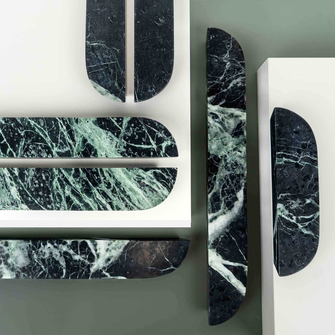Verleihen Sie Ihren Schränken oder Möbeln einen markanten Ausdruck mit diesem Griff aus exklusivem Green Flower-Marmor – einem Naturstein, der für seine lebhaften grünen und weißen Adern bekannt ist. Jedes Griffpaar ist ein Unikat, bei dem Muster und Farbnuancen auf eine Weise variieren, wie es nur echter Stein vermag. Die Griffpaare sind aus einem einzigen Steinblock gearbeitet, sodass die Maserung nahtlos ineinandergreift. Sie besitzen eine fein geschliffene Oberfläche mit seidenmatter Ausführung.