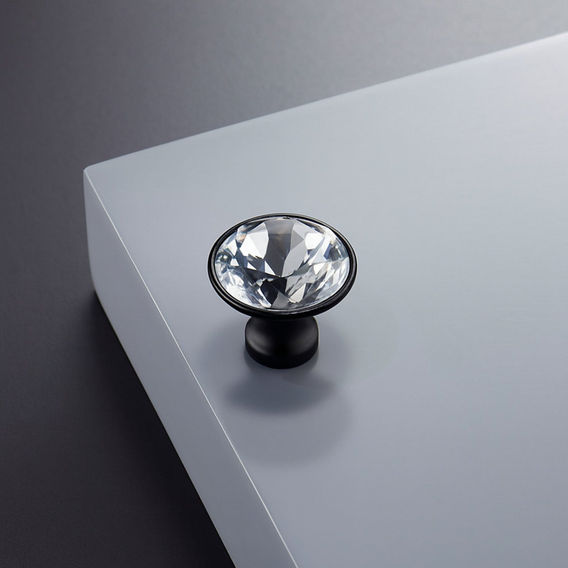 Eleganter schwarzer Knopf mit einem eingelassenen Stein aus künstlichem Kristall (Quarz), der eine einzigartige und luxuriöse Note verleiht. Dieser dekorative Knopf ist ideal, um den Stil von antiken Möbelstücken und Kommoden zu betonen, und passt auch hervorragend auf Kommoden im Shabby-Chic-Stil, um einen schönen Kontrast zwischen Vintage und moderner Eleganz zu schaffen. Perfekt für alle, die ihren Möbeln ein persönliches und stilvolles Upgrade mit einem luxuriösen Hauch von Edelsteinen verleihen möchten.