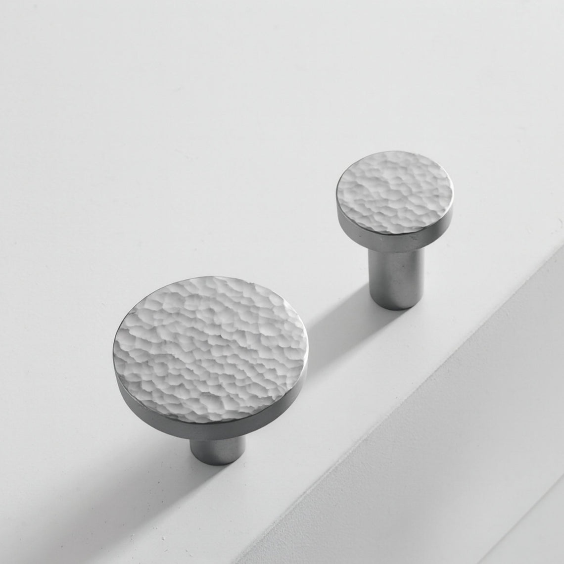 Gehämmerter Messingknopf in einer eleganten, matt verchromten Nuance – ein stilvolles Detail, das sowohl Möbeln als auch Räumen Charakter verleiht. Jeder Knopf wird in der Fabrik von Hand gehämmert, wodurch ein einzigartiges Muster und eine persönliche Note bei jedem Exemplar entstehen. Ideal für alle, die einen exklusiven und authentischen Look für Küchenschränke, Kommoden oder Schranktüren suchen. Verleihen Sie Ihrem Zuhause mit diesen individuell gemusterten Knöpfen eine einzigartige Note.